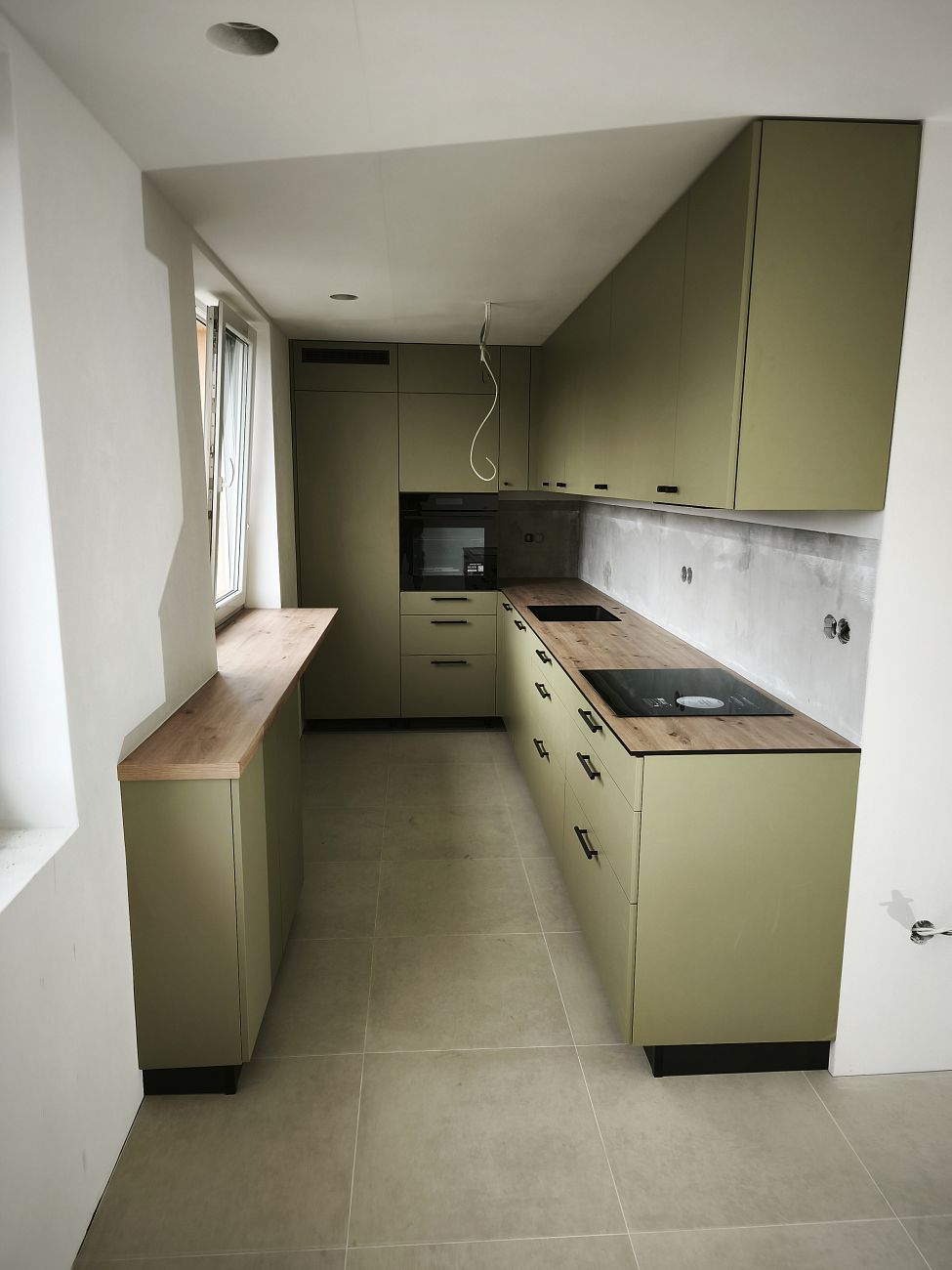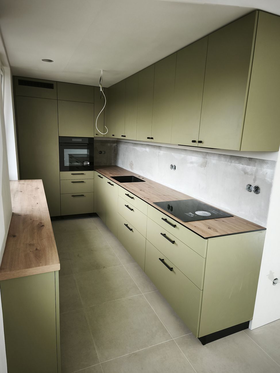 Realizace úzké rohové kuchyně do L ve Stříteži u Poličky proběhla s důrazem na maximální využití prostoru a praktičnost v každém detailu. Tato moderní kuchyň v přírodních odstínech je vyrobená v dekoru U640 Olivově zelená, který prostoru dodává svěží a příjemnou atmosféru. Pracovní kompaktní deska v dekoru H1318 Dub divoký umožnila díky své odolnosti doplnit kuchyň dřezem se spodní montáží. Tento typ instalace dřezu si v posledních letech získal velkou oblibu díky své praktičnosti i minimalistickému vzhledu.