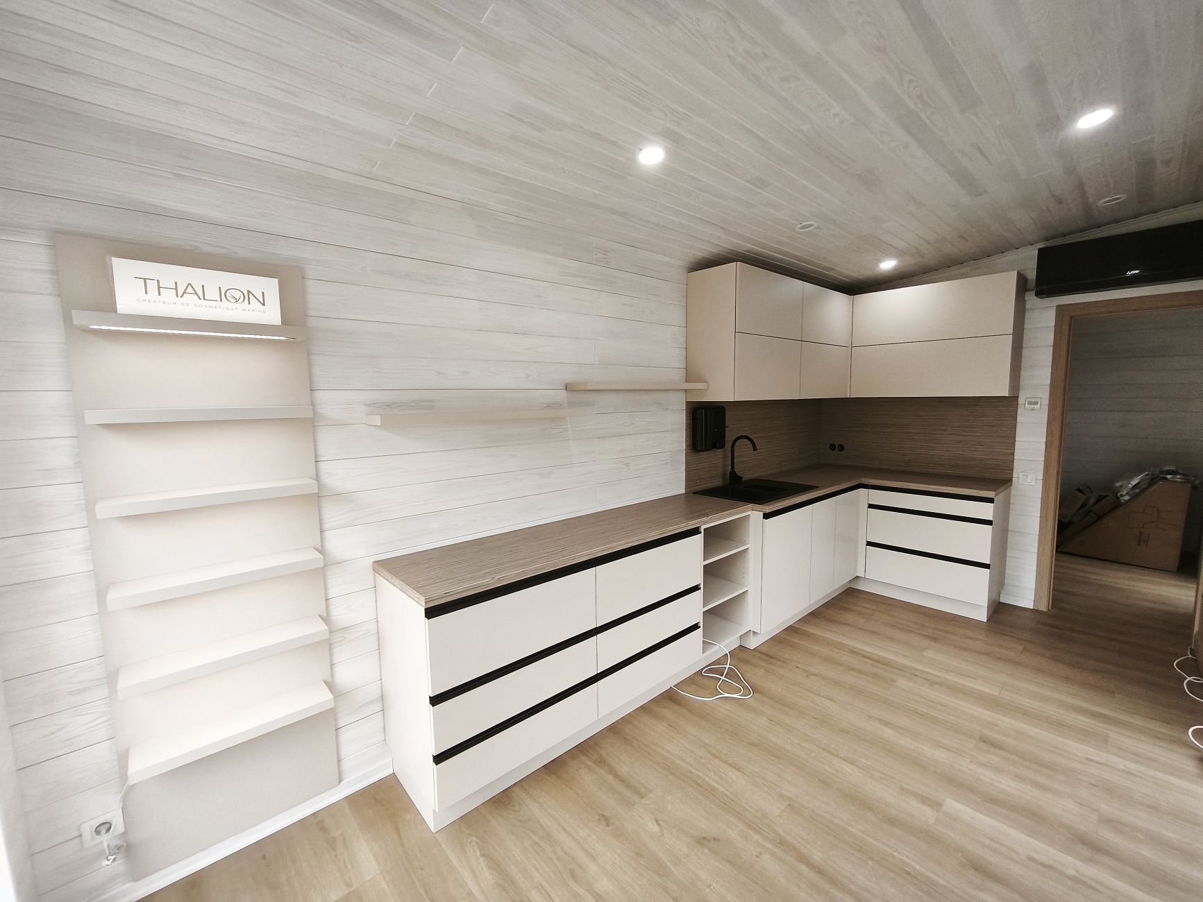 Nábytek na míru jsme vyrobili v dekoru U156 pískově béžová, který krásně ladí s bílými stěnami i celkovým světlým konceptem salonu. Pracovní deska v dekoru H305 Dub Tonsberg dodává interiéru přírodní nádech a zároveň zajišťuje potřebnou odolnost při každodenním používání.